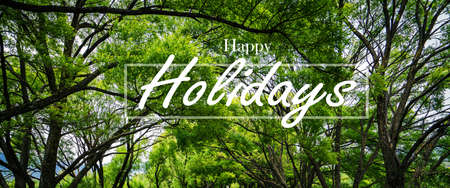 Happy Holidays Text Over nature green tree Background.