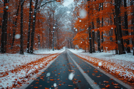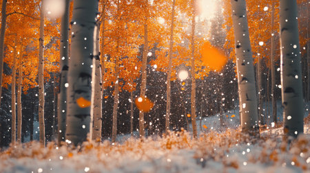 A beautiful forest showcases vivid orange and yellow leaves on trees amidst gentle snowfall. The serene atmosphere highlights the transition of seasons, blending autumn hues with winter's first snow.