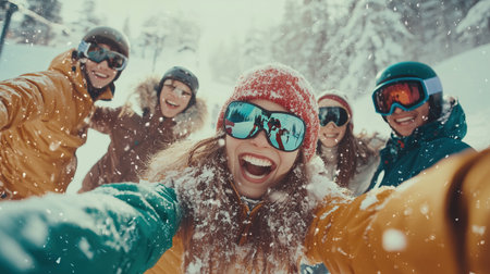 Group of young friends having fun at New Year, on mountains chalet background, smiling and taking selfies. Generative AI