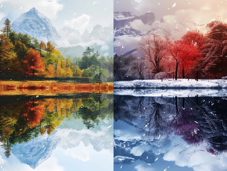 A split reflection of a mountain in two seasons.