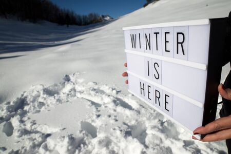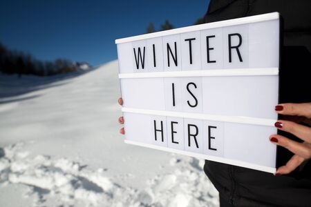 Slogan winter is here held by a woman in a snowy landscape.