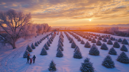 A Christmas tree farm with rows of evergreen trees dusted with snow and families picking the perfect tree.