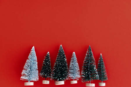 Stylish little christmas trees on red background flat lay. Modern minimalist greeting card with space for text. Merry Christmas and Happy New Year! Minimal xmas flat lay