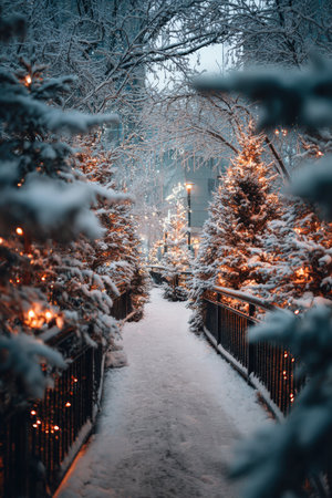 A dreamy snow-covered walkway lined with Christmas trees, adorned with glowing lights. The scene captures a serene, cinematic winter atmosphere, perfect for the holiday season.