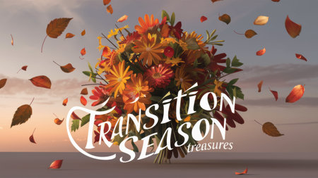 A bouquet of flowers with leaves and seeds flying around it, AI
