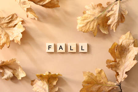 Golden oak leaves as border and wooden letters with text - Fall. Autumn pattern on beige background. View from above.