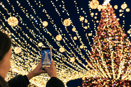 A woman takes photo of tall urban festive Christmas tree on smartphone.