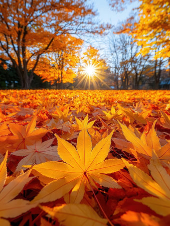 Autumn maple leaves with sunbeams in the background, Japan