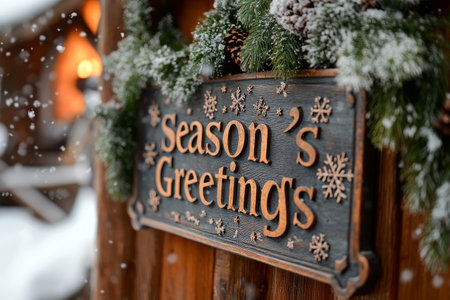 A wooden sign with 'Season's Greetings' text surrounded by snowy pine branches and snowflakes.