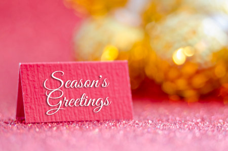 Season's Greetings text on red notepad with blurred golden Christmas balls.