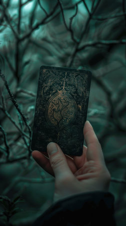 In the gloom, a hand holds an oracle card, love and death intertwined deeply