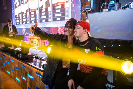 MOSCOW - DECEMBER 23 2019: esports event of a Counter Strike game. Danish player Patrick es3tag Hansen making selfie with girl fan on a tribune at tournaments arena.