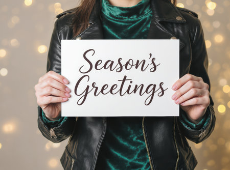 Close-up of a woman in a leather jacket and green velvet top holding a white card with the text Season's Greetings written in elegant script, with a golden bokeh background.