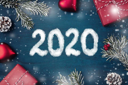 New Year celebration and festive background with 2020, snowflake and Christmas decorations top view.