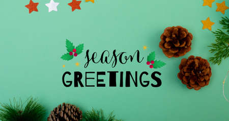 Overhead view of season greetings over pine cones and needles with star shapes on blue table. digital composite of christmas celebration and decoration.