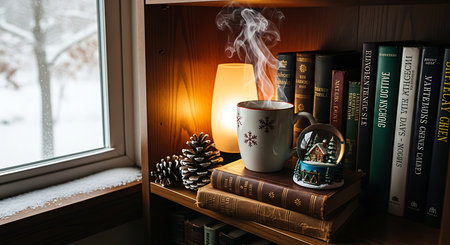 A warm, inviting scene of a steaming mug and books next to a window on a cold winter day.
