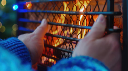 A pair of hands gently holds a fireplace grate, inviting warmth from the flickering flames. This image captures the essence of cozy moments spent indoors during the winter.