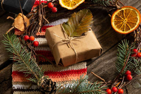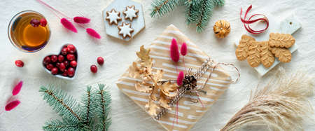 Wintertime holiday background. Gift box wrapped in craft brown paper. Natural dry oak and bunny tail grass decorations. Fir twigs, cranberry, star cookies.