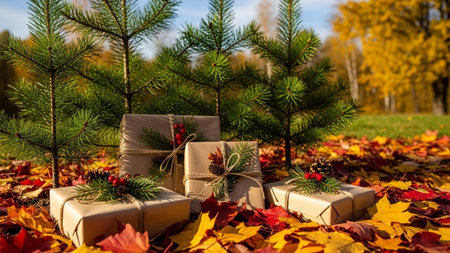 Gift boxes and Christmas trees on the background of autumn leaves.