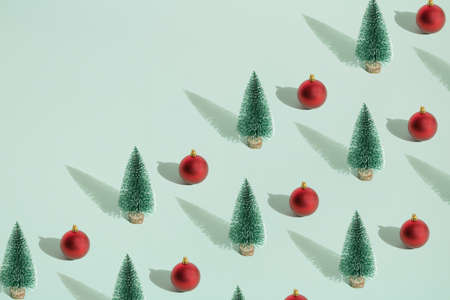 Arranged green New Year and Christmas tree with red bauble on a mint pastel background. Pattern. Copy space.