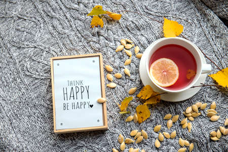 Cozy and soft autumn background. Cup of tea and warm knitted sweater.