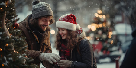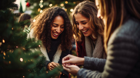 Join the joyous outdoor celebration as a group of happy female friends comes together to decorate a Christmas tree, capturing the warmth of holiday friendship