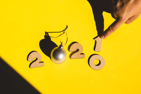 Wooden numbers 2021 chainging 2020 with woman hand and a silver christmas ball on a yellow background. Minimal new year concept.