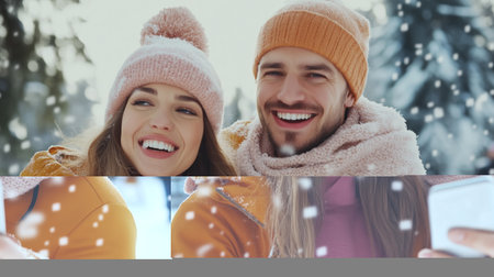 Happy young friends smiling at camera of mobile phone, they posing together against the country house in winter day