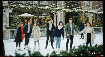 A group of friends ice skating outdoors during winter, surrounded by festive lights and decorations