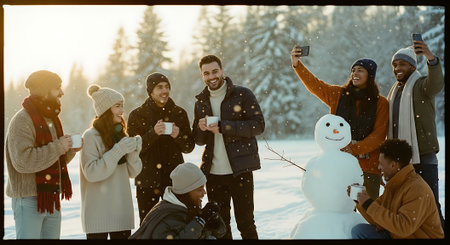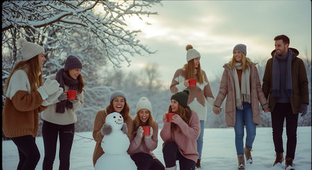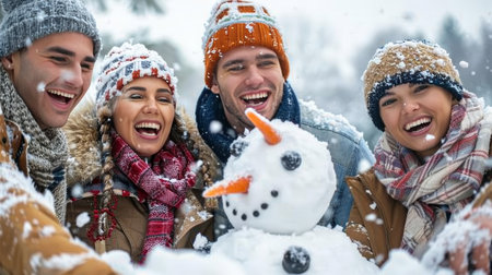 Joyful group of friends creating a snowman in a picturesque snowy park on a delightful winter day