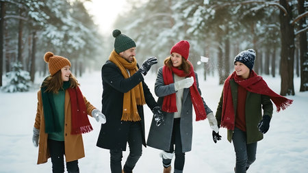 A joyful group of teenagers engaging in a snowball fight outdoors during winter. Laughter and excitement fill the air as they play and enjoy the snowy landscape.