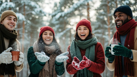 Group of friends having fun on a winter picnic, drinking hot tea.