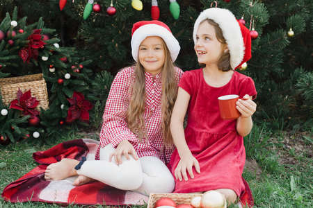 Merry Christmas. Portrait of two funny children girls in Santa hat eating gingerbread cookies drinking hot chocolate outside having fun. Happy Holidays. kids enjoying holiday. Christmas in July
