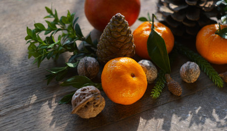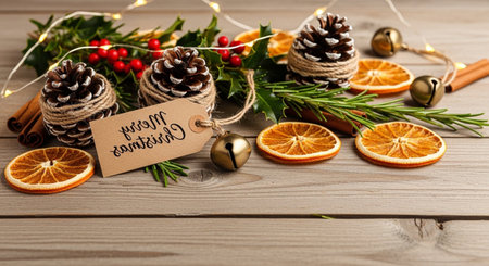 Christmas greeting card with fir cones, tangerines and berries on wooden background