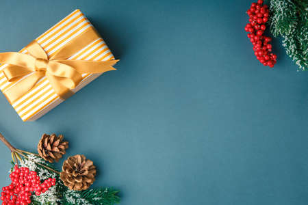 Christmas and New Year holiday background with spruce branches and red berries. Christmas card. Christmas gifts on a white background, top view. Place for text.
