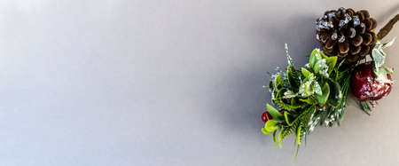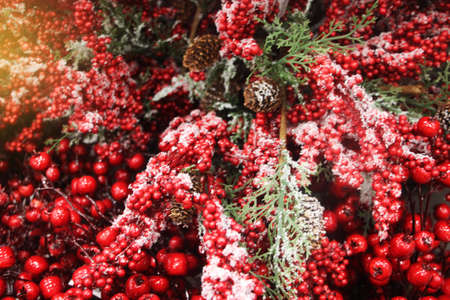 New year holiday evergreen tree, Christmas tree branches decorated with viburnum berries and cones.
