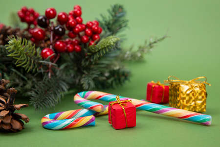 Christmas background with lights, ornaments, candy and decorations. Free space