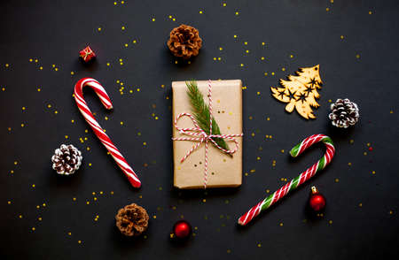 Christmas craft gift boxes with red ribbons, pine cones and red and golden decorations. Christmas flat lay, top view.