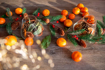 New Year's composition of tangerines and Christmas tree branches on a wooden background. christmas background
