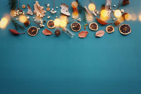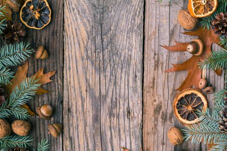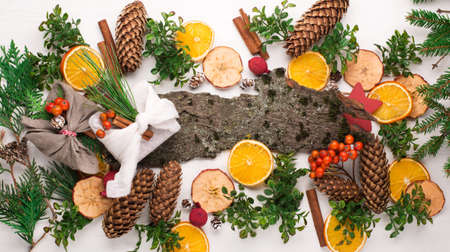 Christmas background with christmas decorations. Flat lay winter holiday composition with fir branches, walnuts, dried oranges, cones, and cinnamon sticks. Top view, copy space