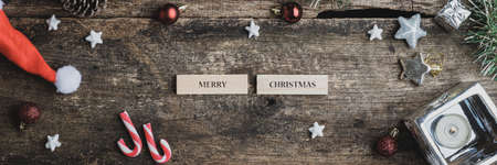 Merry Christmas sign on wooden pegs placed in the middle of holiday decorations and ornaments scattered on rustic wooden desk.