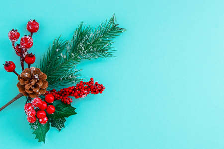 Christmas tree branch with red berries, pine cone and snowflakes. Turquoise background.