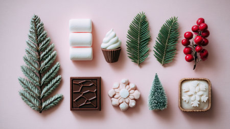A delightful arrangement featuring festive desserts and seasonal decorations, set against a soft pink background, creating a warm holiday ambiance perfect for celebrations.