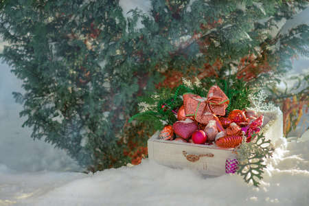 Christmas gifts surrounded by Christmas decorations. Snowflakes and leaves on a Christmas tree