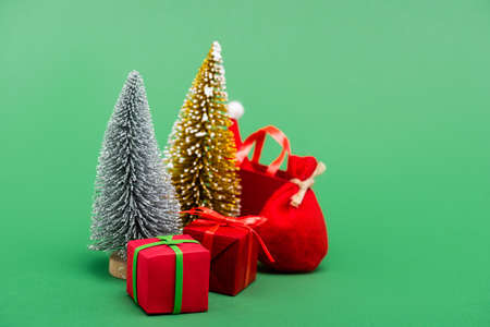 decorative silver and golden christmas trees near gift boxes, sack and shopping bag with santa hat on green