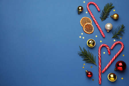 Flat lay composition with sweet candy canes and Christmas decor on blue background, space for text