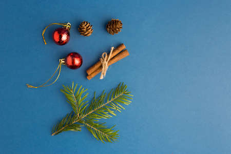 Blue Christmas background with fir tree branch, christmas baubles, cones and cinnamon. Flat lay style. Color of the year