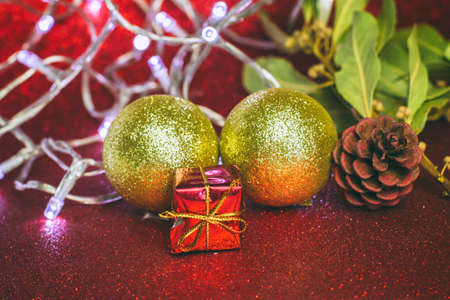 Decorating Christmas tree close up. Close up on Christmas tree and Christmas decorations.