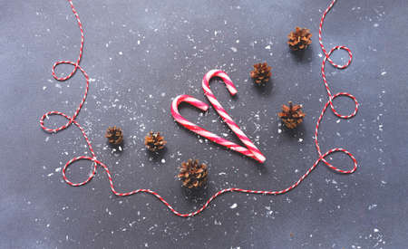 New Year or Christmas background. Flat lei made from pine cones, Christmas toys and lollipops on a blue background. Ideal for Christmas cards, wrapping paper.
