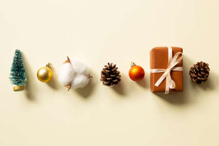 Fir tree, bauble, cotton plant, pine cone, gift box on beige background. Winter christmas concept. flat lay, top view, copy space